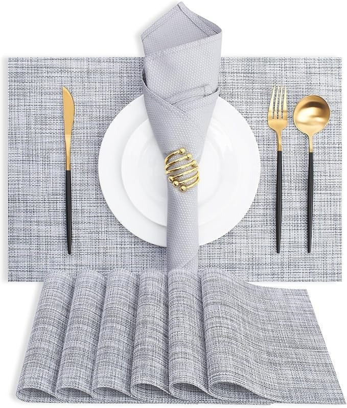 Premium vinyl placemats with heat-resistant, non-slip woven design. Fray-proof edges, easy-clean durability for patio/garden dining. Elegant functionality meets timeless surface protection.