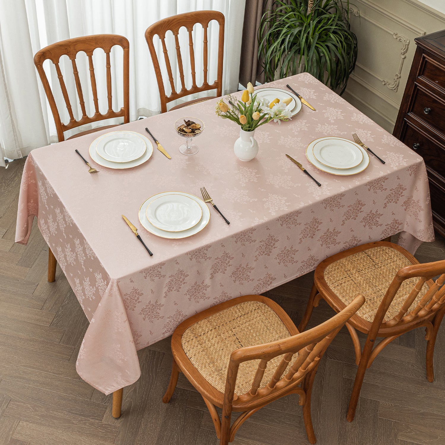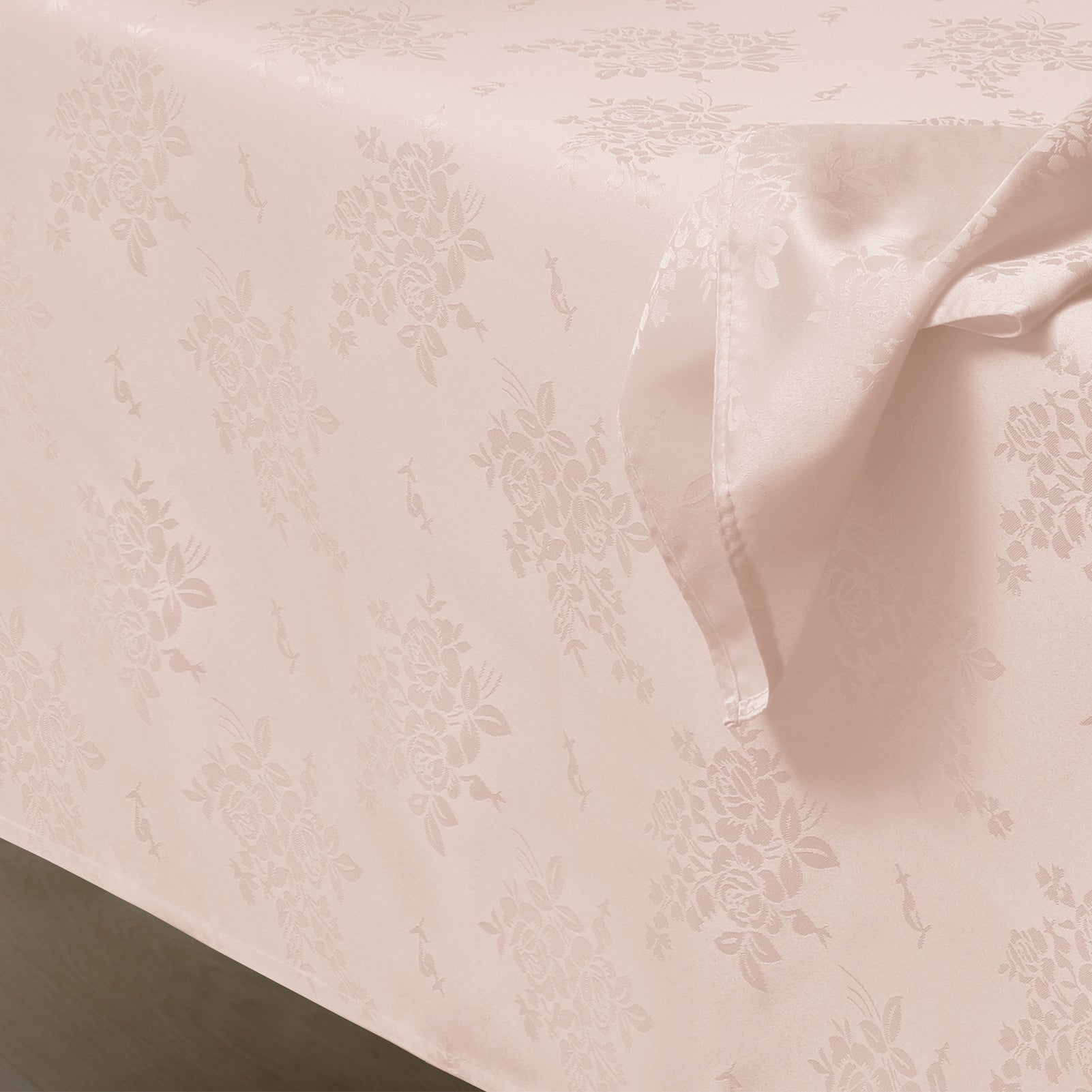 Polyester Jacquard Waterproof Elegant Damask Rose Floral Pattern Tablecloth in Light Pink