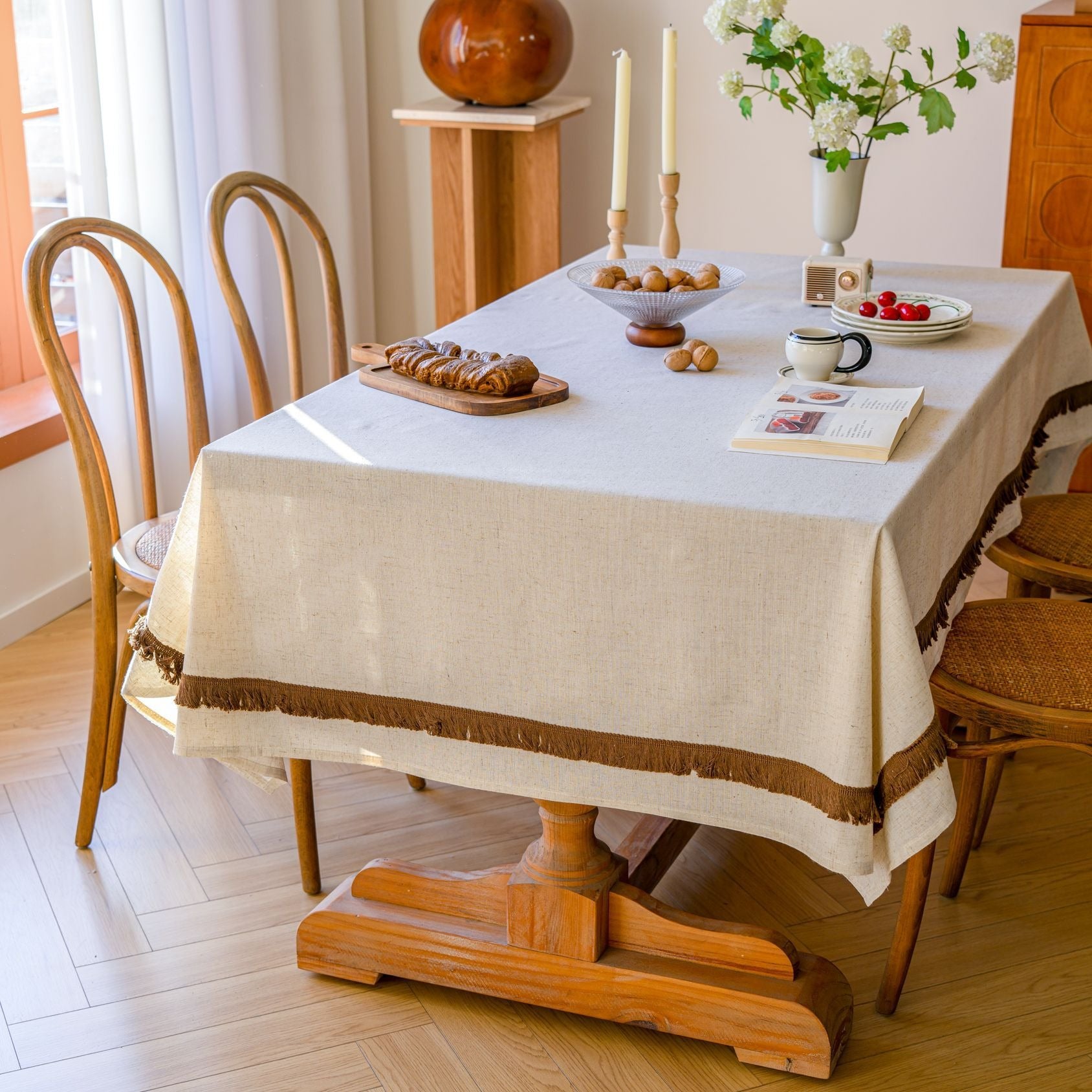 White Polyester Linen Tablecloth with Brown Tassel Lace
