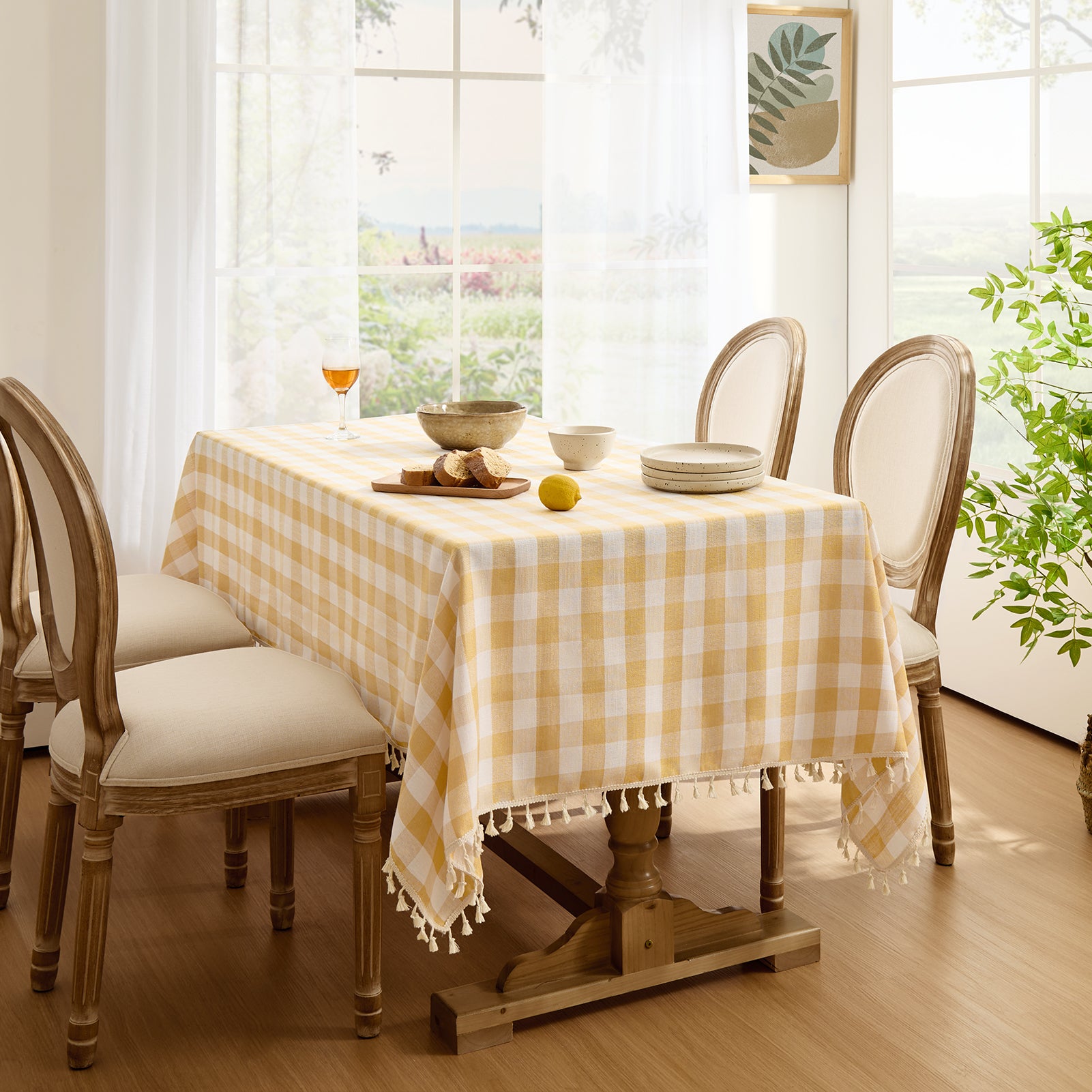 Wrinkle-Resistant Cotton Blend Classic Gingham Tablecloth with Tassels in Yellow